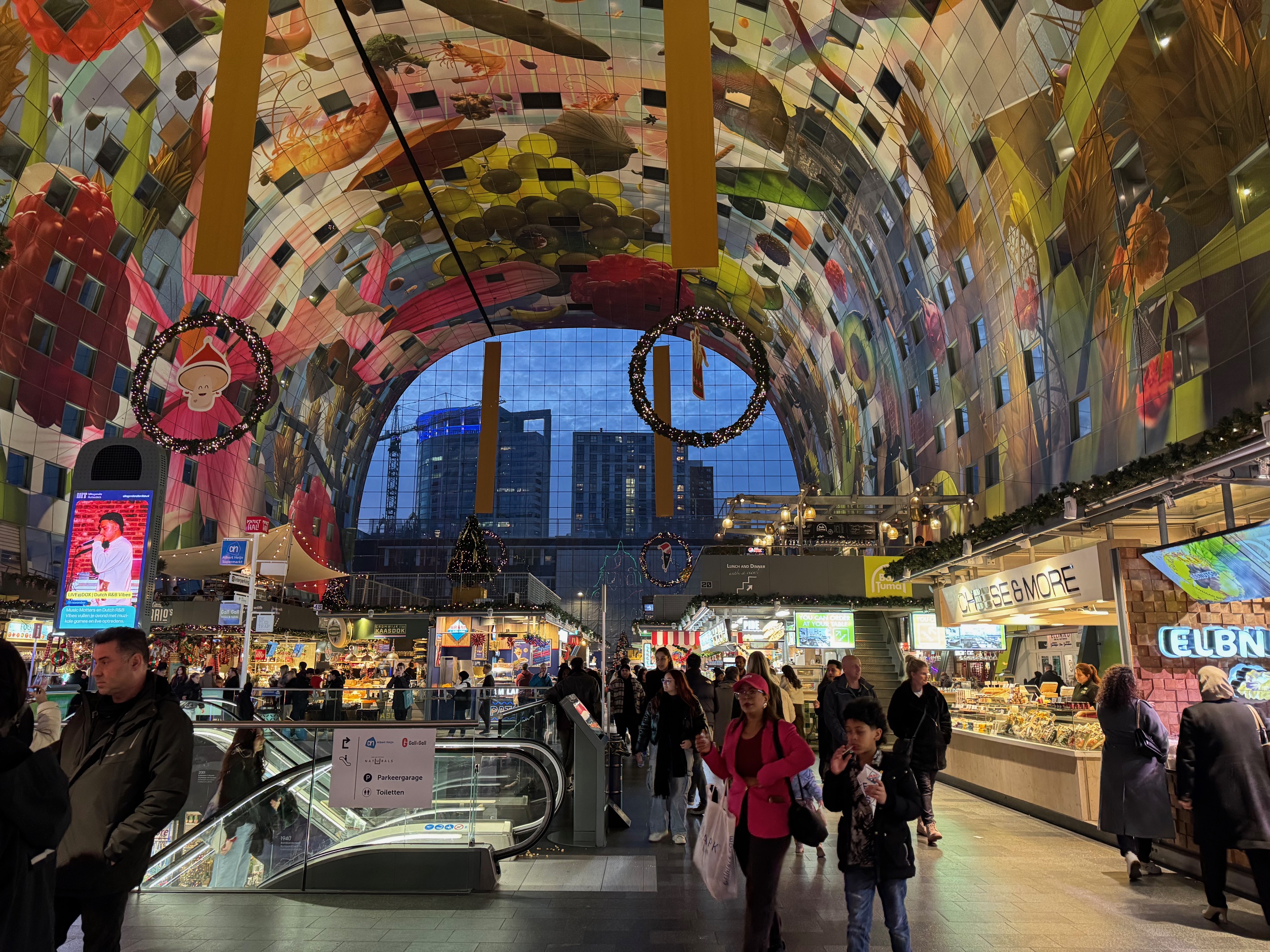 A new shopping center in the old section of Rotterdam, call the Markthal. There are apartments in the arched structure, and shops in the center. There are more floors of shops under the ground. The picture below shows the inside main level. Notice the beautiful ceiling.