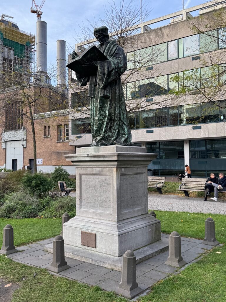The philosopher Erasmus was born and raised in Rotterdam. They have his boyhood home marked with a special formation. This statue of him is close by his boyhood home.